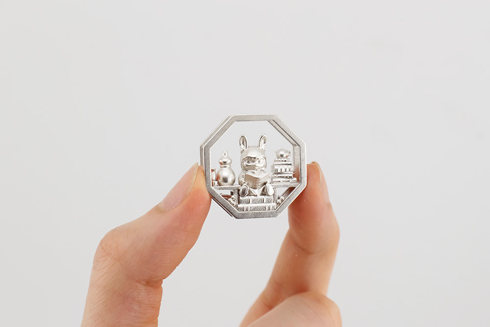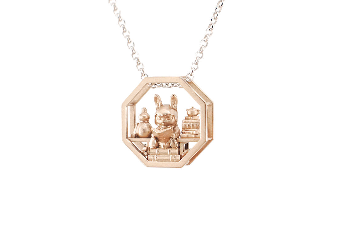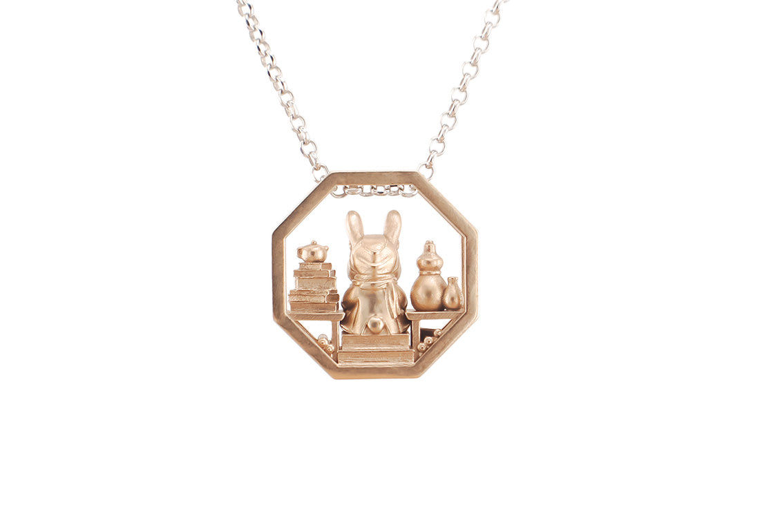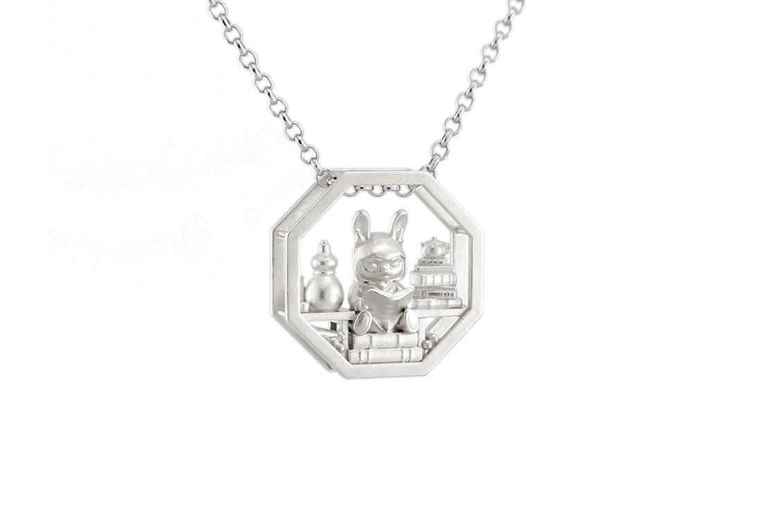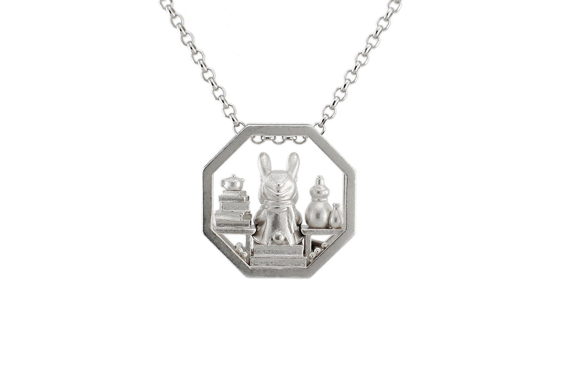 A companion piece to the Prunus Flower Pendant. If you'd like a larger rabbit companion, visit Hawthorn the Adventurer (vinyl figure) or the Rabbit Guardian Jewelry Dish.