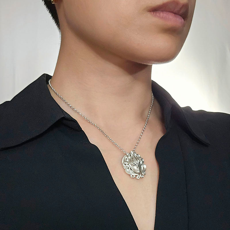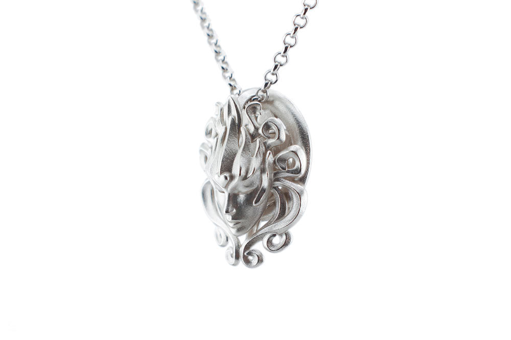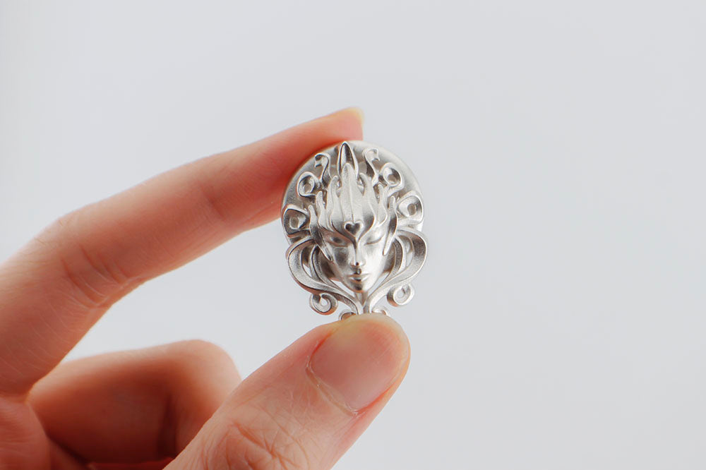 The Sovereign Dreamer pendant is an evolution of my Sovereign Armor mask, but in a more intimate form. It is inspired by Bodhisattva Guanyin statues (the Buddhist Goddess of Mercy and Compassion), Cantonese opera hero outfits, flowing ribbons and the Chinese carvings I grew up seeing at home.