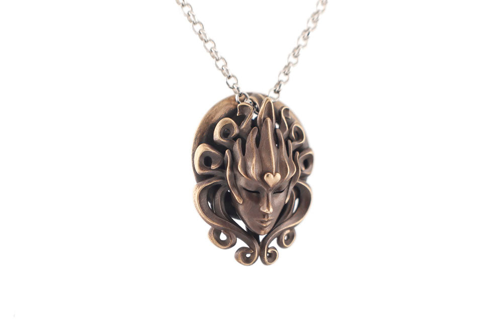The Sovereign Dreamer pendant is an evolution of my Sovereign Armor mask, but in a more intimate form. It is inspired by Bodhisattva Guanyin statues (the Buddhist Goddess of Mercy and Compassion), Cantonese opera hero outfits, flowing ribbons and the Chinese carvings I grew up seeing at home.